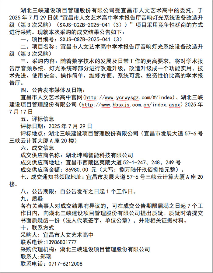 | 宜昌市人文藝術(shù)高中學(xué)術(shù)報(bào)告廳音響燈光系統(tǒng)設(shè)備改造升級(第3次采購)成交結(jié)果公告 |